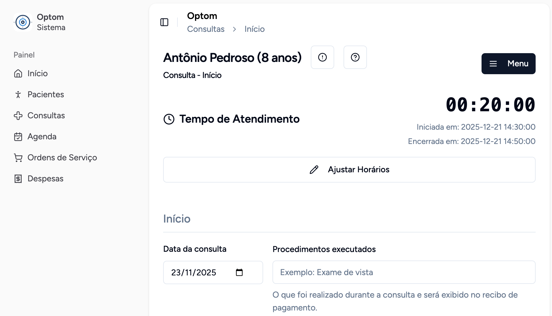 O tempo de atendimento da consulta é exibido. Também é possível clicar para ajustar os horário caso algum erro tenha sido cometido.