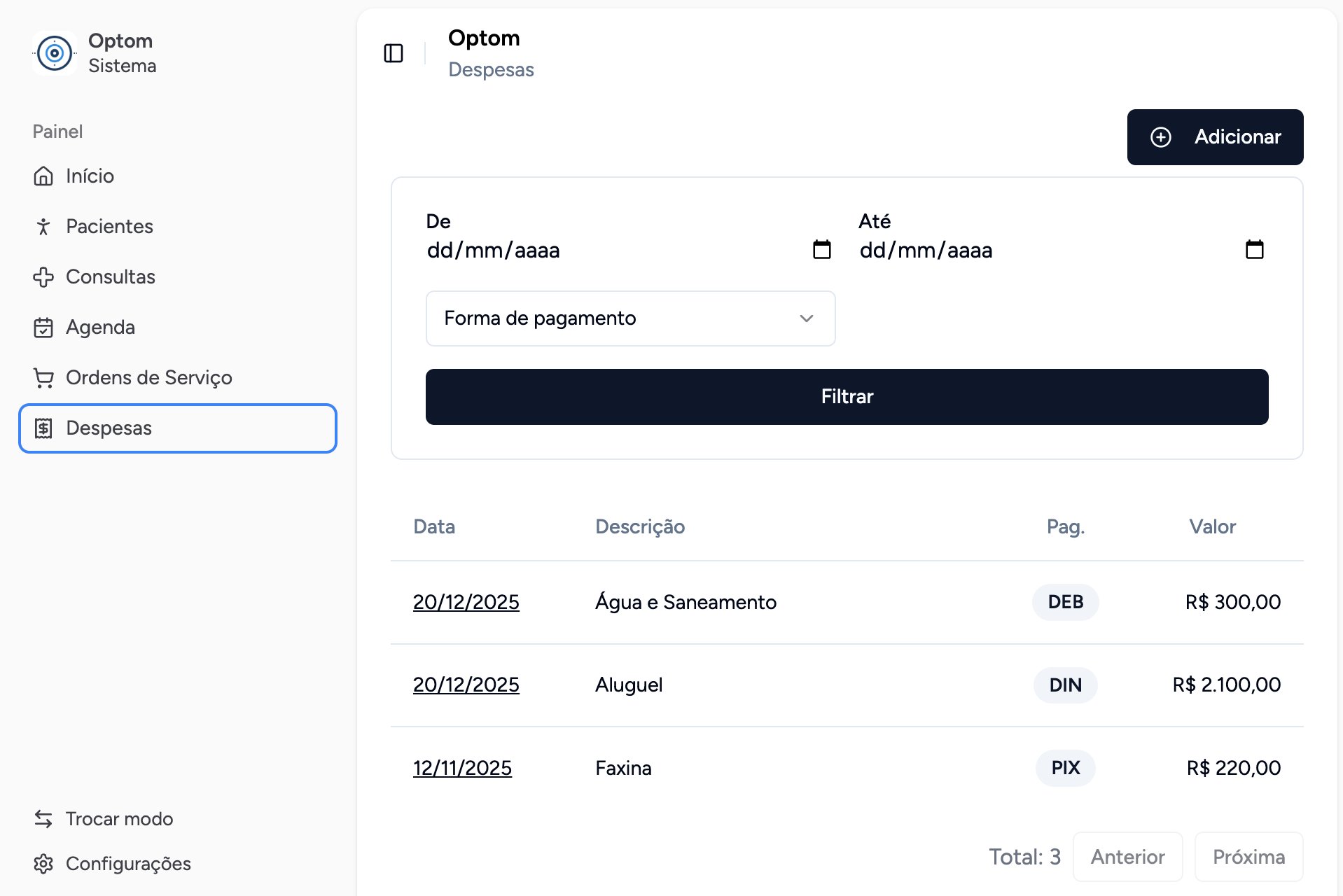 Cadastre no sistema as despesas que tem tido durante o exercício da optometria.