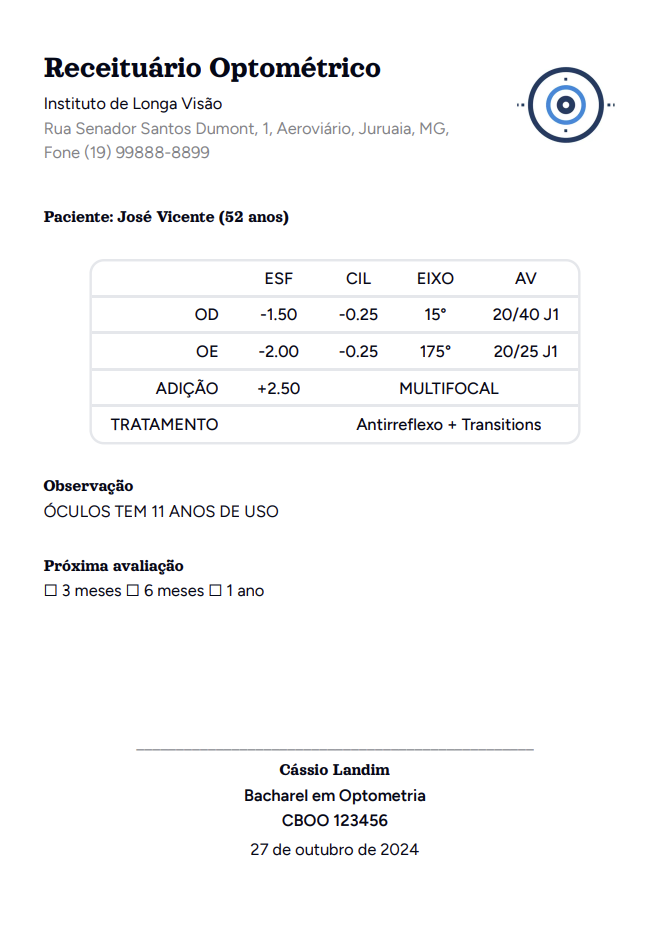 O sistema Optom oferece personalização de acordo com sua marca. Você pode customizar receitas e documentos com o nome de sua clínica, endereço, telefone, logotipo e outros, garantindo alinhamento com sua identidade visual.