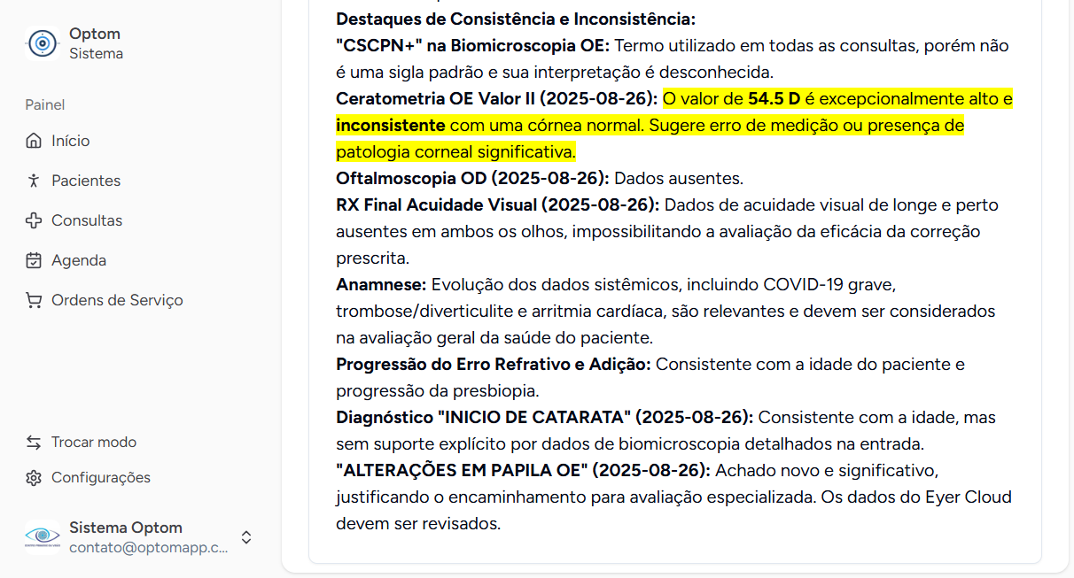 Transforme dados em decisões clínicas. Nossa IA analisa o histórico do paciente para revelar a evolução entre consultas, garantir a integridade dos dados e apoiar a precisão do diagnóstico.